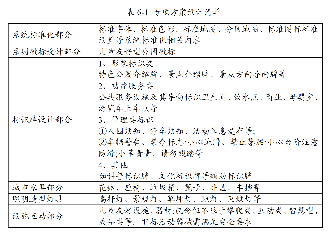 2.设计要点:包括但不限于系统标准化、系列徽标、标识标牌、城市家具、造型灯具、互动设施等专项方案,参赛者可自选1个或多个专项报名参赛。旨在为儿童成长发展提供适宜的条件、环境和服务。专项方案设计清单见表6-1所示。当某一专项报名单位少于5家(含5家)的取消此项评比。