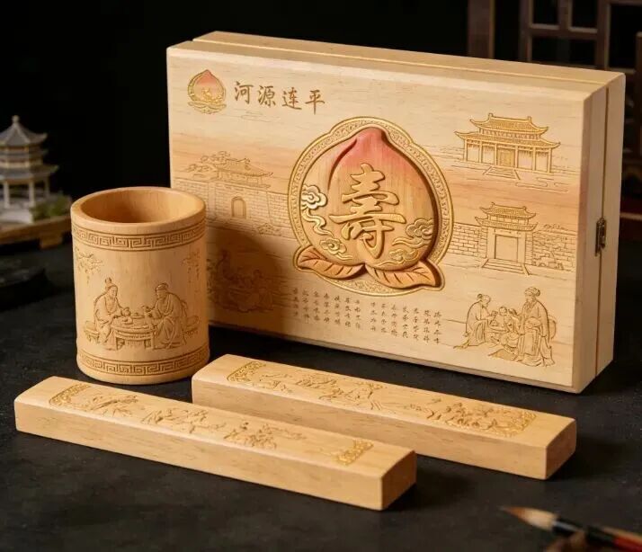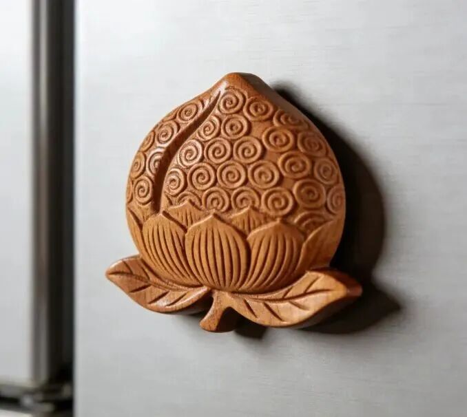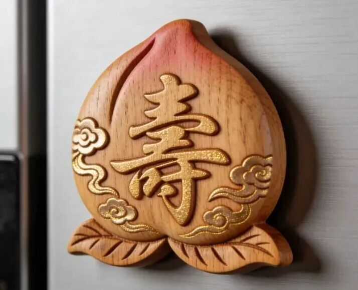 桃木旅游纪念品/工艺品:小巧便携,融合地域文化,适合旅游消费场景,如冰箱贴、小雕件、文创小物、纪念套装等