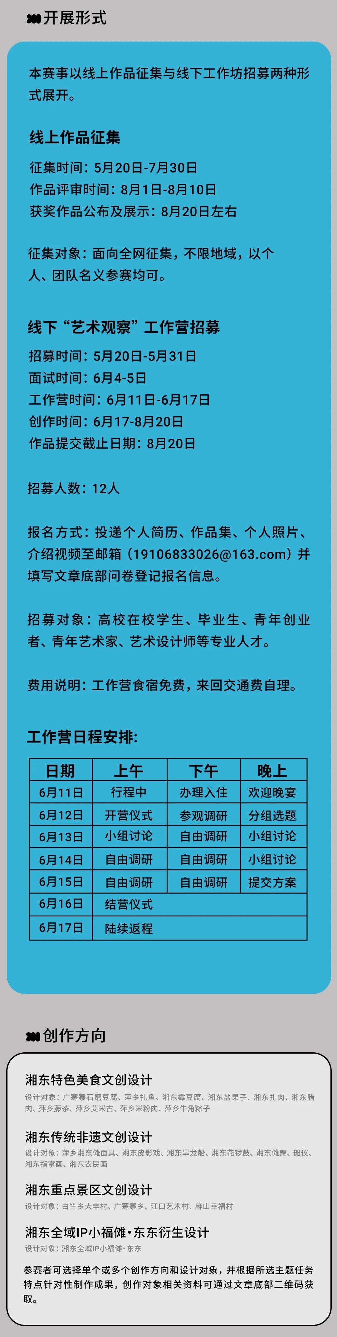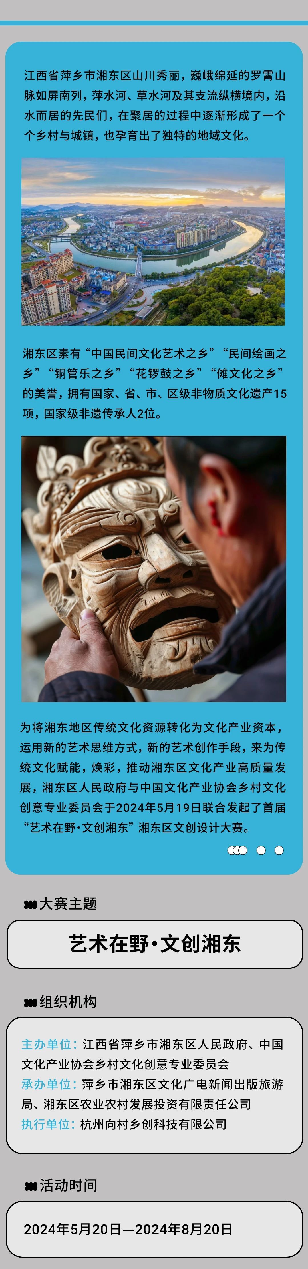 2024首届“艺术在野 文创湘东”湘东区文创设计大赛艺赛中国5月26日 19:21发布1341 识别下方二维码提交工作营报名信息 识别下方二维码获取创作对象资料 © 版权声明文章版权归作者所有,未经允许请勿转载。THE END国内赛事# 大赛# 2024# 文创# 在野# 湘东 喜欢就支持一下吧