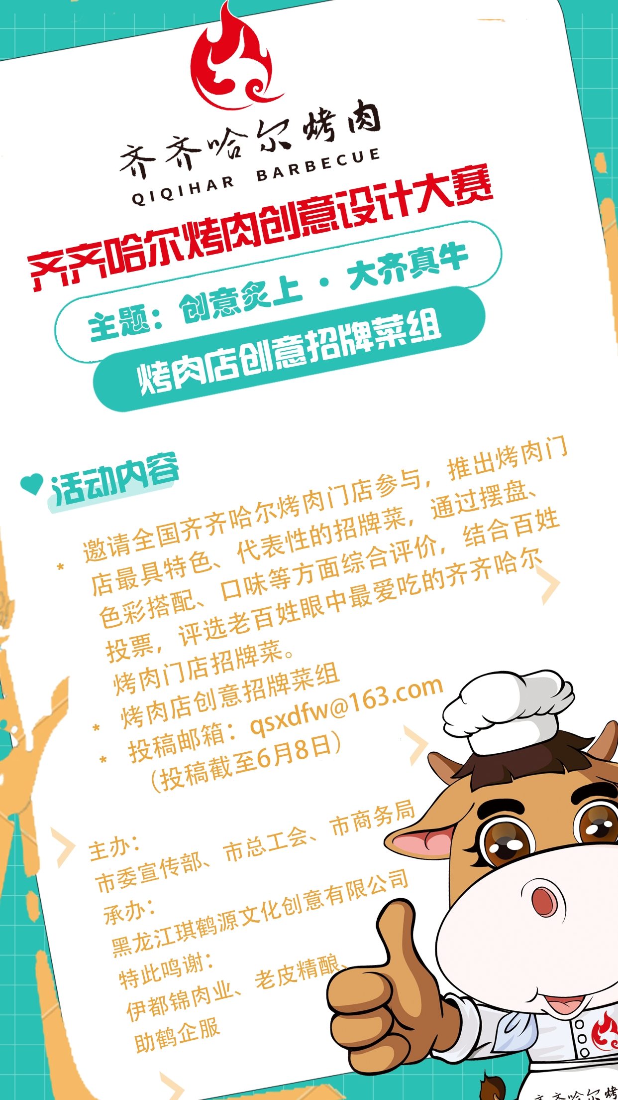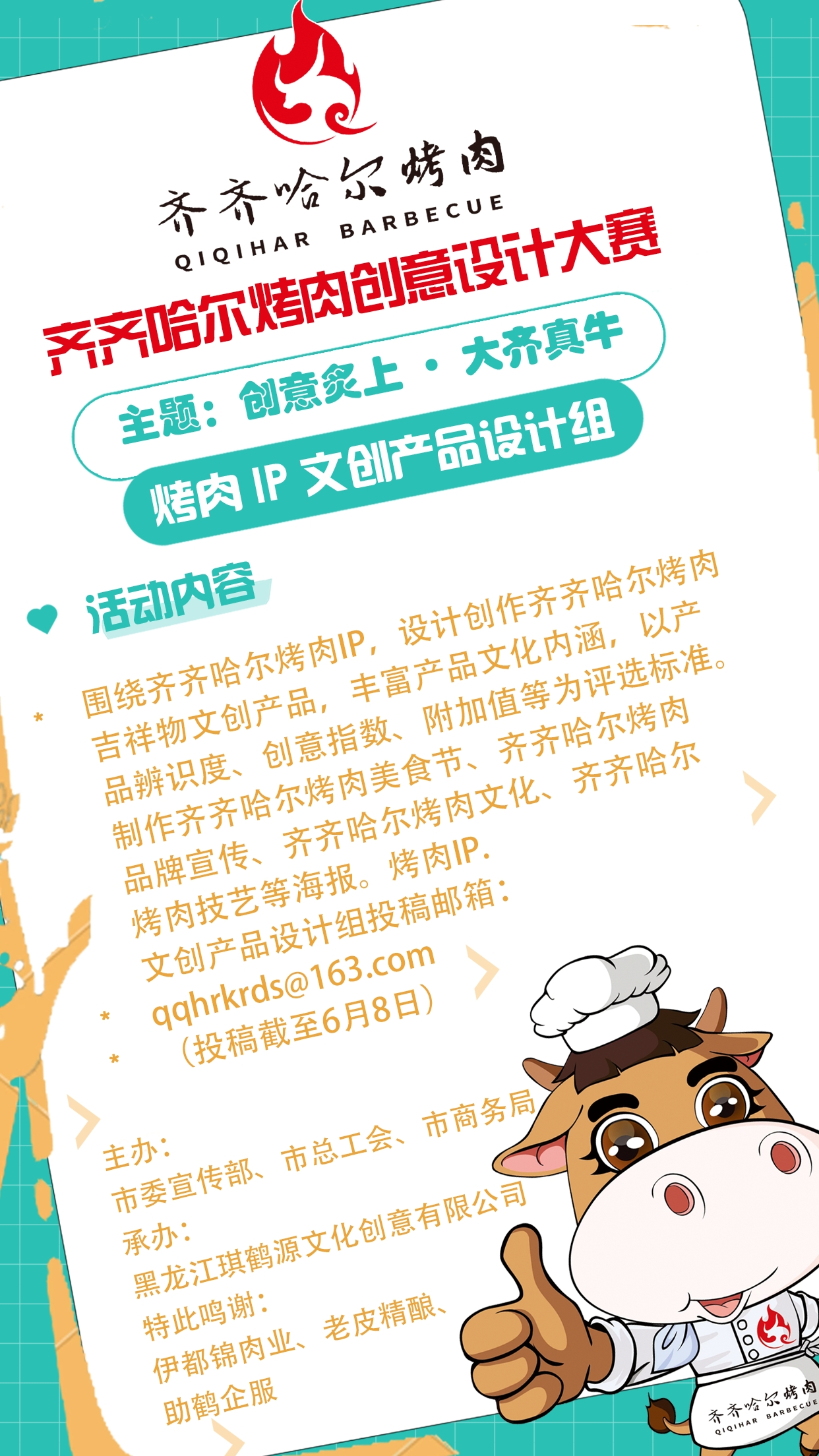 围绕齐齐哈尔烤肉IP,设计创作齐齐哈尔烤肉吉祥物文创产品,丰富产品文化内涵,以产品辨识度、创意指数、附加值等项目作为评选标准。制作齐齐哈尔烤肉美食节、齐齐哈尔烤肉品牌宣传、齐齐哈尔烤肉文化、齐齐哈尔烤肉技艺等海报。