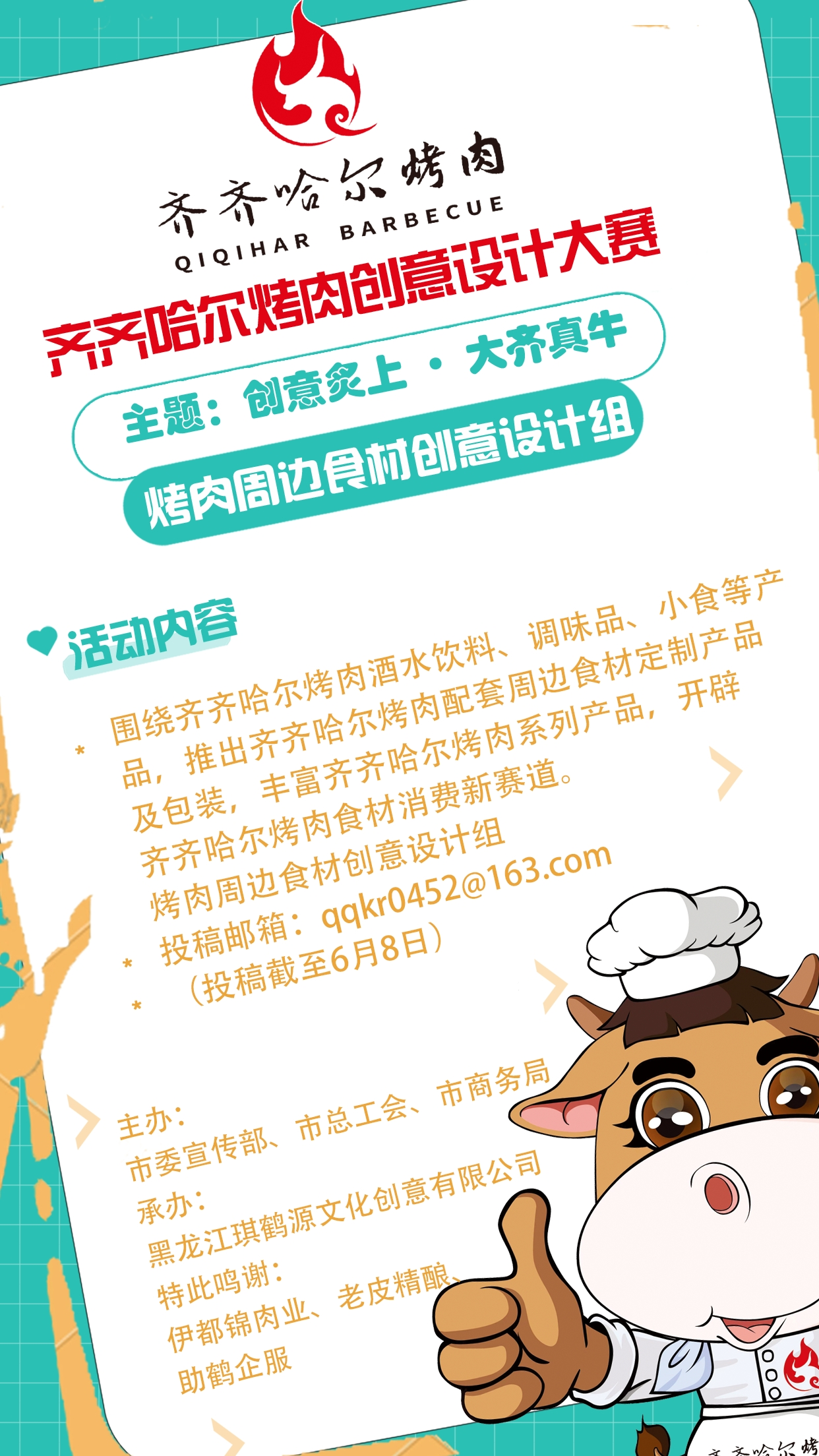 为推动齐齐哈尔烤肉与创意设计产业深度融合发展,运用更多创意设计元素赋能齐齐哈尔烤肉产业发展,促进烤肉文化内涵的丰富与发散,增强齐齐哈尔烤肉吉祥物“大齐真牛”知晓率,提升齐齐哈尔烤肉品牌影响力。按照市委、市政府相关部署,市委宣传部、市总工会、市商务局决定联合组织开展齐齐哈尔烤肉创意设计大赛。具体安排如下: