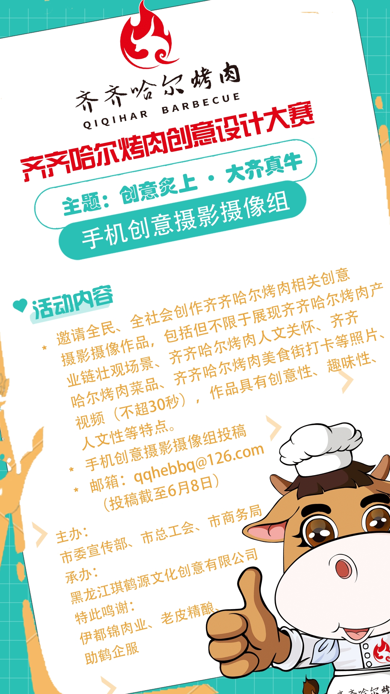 邀请全民、全社会创作齐齐哈尔烤肉相关创意摄影摄像作品,包括但不限于展现齐齐哈尔烤肉产业链壮观场景、齐齐哈尔烤肉人文关怀、齐齐哈尔烤肉菜品、齐齐哈尔烤肉美食街打卡等照片、视频(不超30秒),作品具有创意性、趣味性、人文性等特点。