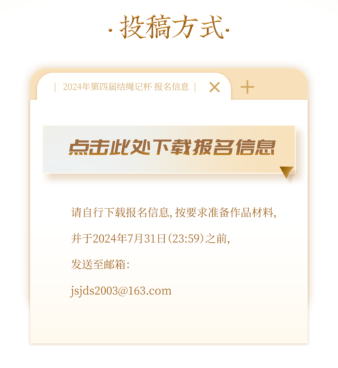 2024结绳记杯 | 第四届中国结绳文化创意设计大赛艺赛中国6月20日 23:52发布1305 点击下载:第四届结绳记杯中国结绳文化创意设计大赛 © 版权声明文章版权归作者所有,未经允许请勿转载。THE END国内赛事# 大赛# 2024# 创意# 中国# 文化 喜欢就支持一下吧