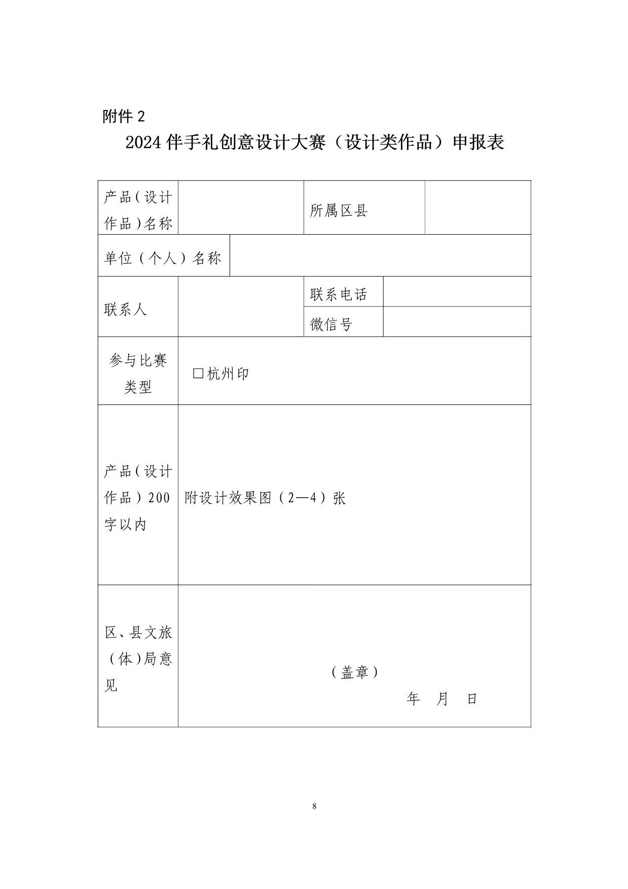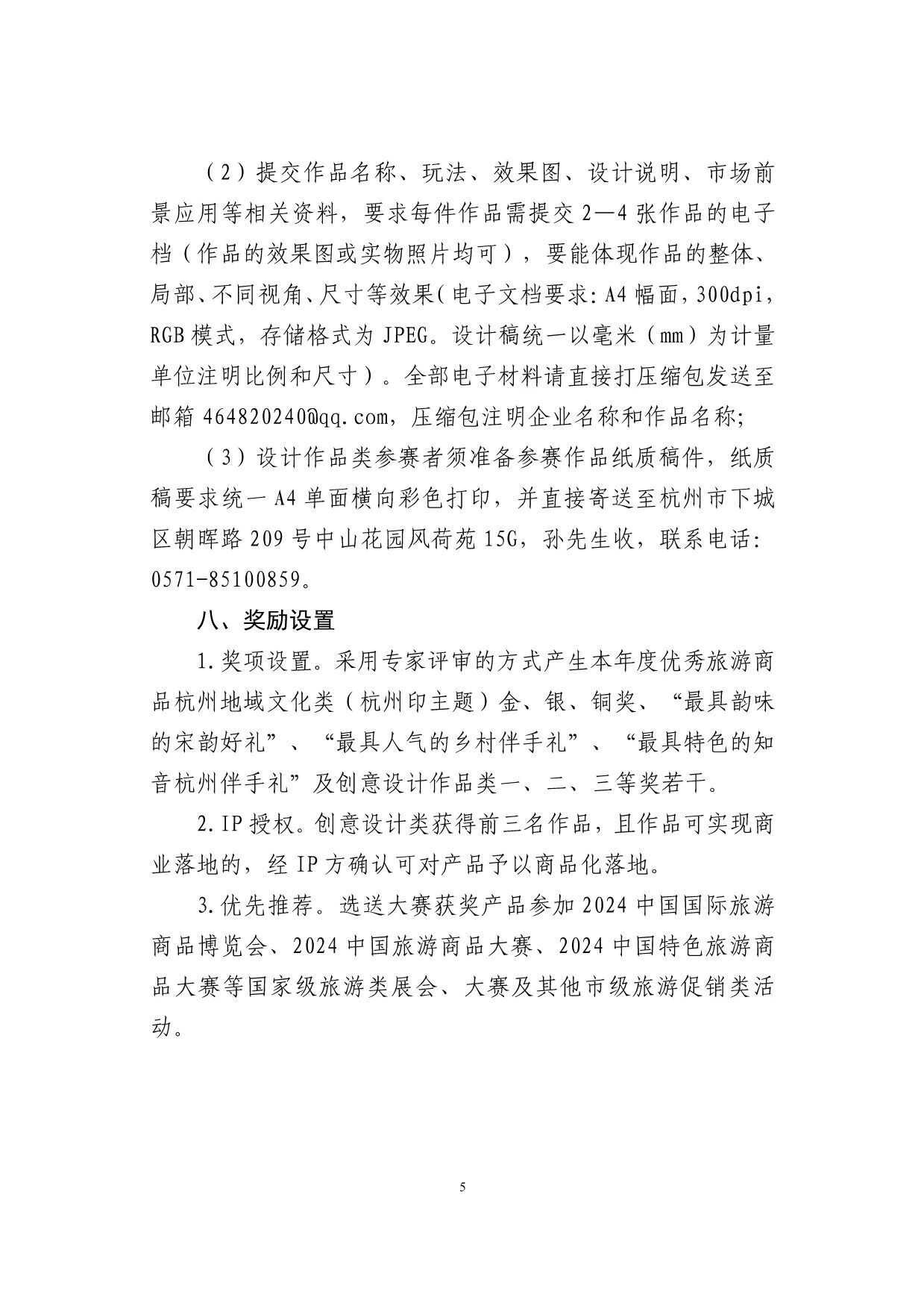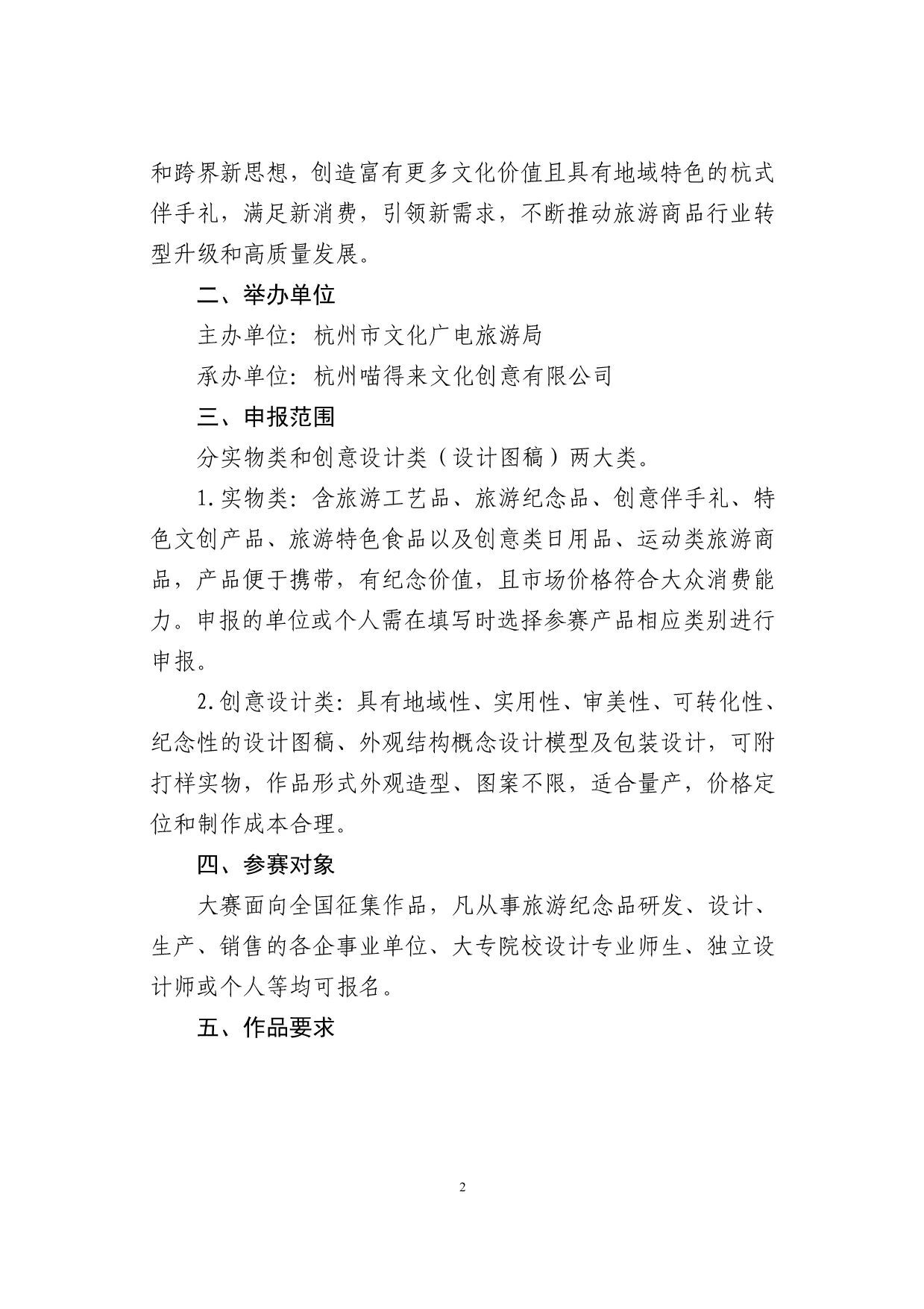 “韵味杭州·游礼相伴”2024杭州伴手礼创意设计大赛艺赛中国7月20日 23:50发布933 为了进一步推进文旅消费品牌创建行动,努力用创新思维积极引导旅游商品和产业升级,着力打造宋韵历史文化标签,助力杭州后亚运时期旅游纪念品的蓬勃发展,拟在全市组织开展“韵味杭州•游礼相伴”2024杭州伴手礼创意设计大赛(以下简称“大赛”),现将有关事宜通知如下: 一、活动主题 大赛以“杭州印”为主题,以“杭式宋韵”“在地乡村”“知音杭州”为核心,以创新设计为宗旨,综合利用全新线上平台,积极培育、打造“文旅+商品”杭州伴手礼品牌,深度挖掘杭州非遗文化资源,结合全新旅游市场需求,融合多产业和跨界新思想,创造富有更多文化价值且具有地域特色的杭式伴手礼,满足新消费,引领新需求,不断推动旅游商品行业转型升级和高质量发展。 二、举办单位 主办单位:杭州市文化广电旅游局 三、申报范围 分实物类和创意设计类(设计图稿)两大类。 1.实物类:含旅游工艺品、旅游纪念品、创意伴手礼、特色文创产品、旅游特色食品以及创意类日用品、运动类旅游商品,产品便于携带,有纪念价值,且市场价格符合大众消费能力。申报的单位或个人需在填写时选择参赛产品相应类别进行申报。 2.创意设计类:具有地域性、实用性、审美性、可转化性、纪念性的设计图稿、外观结构概念设计模型及包装设计,可附打样实物,作品形式外观造型、图案不限,适合量产,价格定位和制作成本合理。 四、参赛对象 大赛面向全国征集作品,凡从事旅游纪念品研发、设计、生产、销售的各企事业单位、大专院校设计专业师生、独立设计师或个人等均可报名。 五、作品要求 1.实物类产品。包含杭州地域特征,有一定文化叙述、传播能力,且内容不杜撰,创意真实可考证,通过实物产品传递出杭州独特韵味,主要围绕四大方面: (1)“杭州印”。杭州风景秀美,人文气息浓厚,素有“人间天堂”的美誉。每一位来到杭州的游客,无不被它的隽丽多姿深深吸引,在回忆中烙下江南的印记。优雅的西湖十景、壮阔的运河、沧桑的良渚、宁静的西溪,以及空前盛大的杭州亚运会……杭州有太多的美好值得被看到。在本次创意设计大赛中,选手可以发挥想象,任创意驰骋,讲述杭州带给人们最深刻的印记,以旅游商品留住杭州独特的韵味。 (2)杭式宋韵。立足宋韵文化底蕴,走进杭式生活,以宋韵故事、宋代美食、宋式元素进行创意设计,设计开发承载宋式经典内容的文创产品,加快推动宋韵文化创造性转化、创新性发展。 (3)在地乡村。依托杭州深厚的历史文化底蕴,以周边区、县特色人文特点为依据,结合人物、符号、传说等元素,开发出能够反映杭州在地乡村文化特色、文化内涵和民俗元素的产品或包装设计。 (4)知音杭州。以杭州音乐文化为主题,通过文创产品的形式,传递杭州的音乐魅力,设计开发具有杭州独特音乐元素的主题伴手礼及音乐周边文化产品,成为杭州音乐文化的新名片,感受杭州的音乐魅力。 2.创意设计类作品。可围绕“杭州印”展开创意,着重以时下市场喜闻乐见的印章作为设计载体,将杭州核心的文旅资源,通过玩法+实物产品、包装、名称、营销等形式,以及现代设计理念予以诠释,用文创重现杭式雅韵,加快推动本地文旅体验新进程。 六、征集时间 即日起至2024年8月10日 七、申报要求 参赛的实物产品(设计作品)必须是自主研发、设计、生产的。创意设计作品必须为原创作品,参评者不得抄袭他人作品,比赛结束后拟获奖名单将进行为期一周的登报公示,凡经举报并核实为抄袭的作品将被取消参赛资格。往年推荐参加评选获奖的相同产品不得参加大赛。 1.实物类产品申报要求: (1)《2024伴手礼创意设计大赛(实物类产品)申报表》(见附件1); (2)参赛实物产品图片(1—2张),包括实物产品包装及裸件(未包装)时的样子; (3)120字以内的故事背景及创意说明。全部电子材料须打压缩包发送至所在地文化和广电旅游体育局(社会发展局),压缩包注明企业名称; (4)参赛实物商品务必在比赛当日评审开始前送达比赛现场(比赛现场评审时间暂定十月中旬,具体另行通知)。 2.设计类作品申报要求 (1)《2024伴手礼创意设计大赛(设计类产品)申报表》(见附件2); (2)提交作品名称、玩法、效果图、设计说明、市场前景应用等相关资料,要求每件作品需提交2—4张作品的电子档(作品的效果图或实物照片均可),要能体现作品的整体、局部、不同视角、尺寸等效果(电子文档要求:A4幅面,300dpi,RGB模式,存储格式为JPEG。设计稿统一以毫米(mm)为计量单位注明比例和尺寸)。全部电子材料请直接打压缩包发送至邮箱464820240@qq.com,压缩包注明企业名称和作品名称; (3)设计作品类参赛者须准备参赛作品纸质稿件,纸质稿要求统一A4单面横向彩色打印,并直接寄送至杭州市下城区朝晖路209号中山花园风荷苑15G,孙先生收,联系电话:0571-85100859。 八、奖励设置 1.奖项设置。采用专家评审的方式产生本年度优秀旅游商品杭州地域文化类(杭州印主题)金、银、铜奖、“最具韵味的宋韵好礼”、“最具人气的乡村伴手礼”、“最具特色的知音杭州伴手礼”及创意设计作品类一、二、三等奖若干。 2.IP授权。创意设计类获得前三名作品,且作品可实现商业落地的,经IP方确认可对产品予以商品化落地。 3.优先推荐。选送大赛获奖