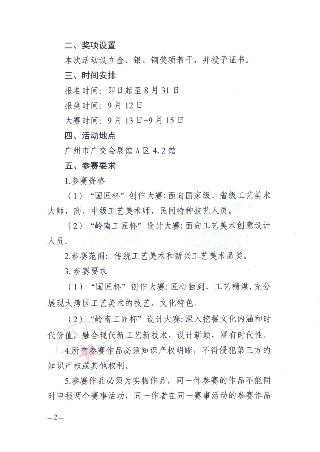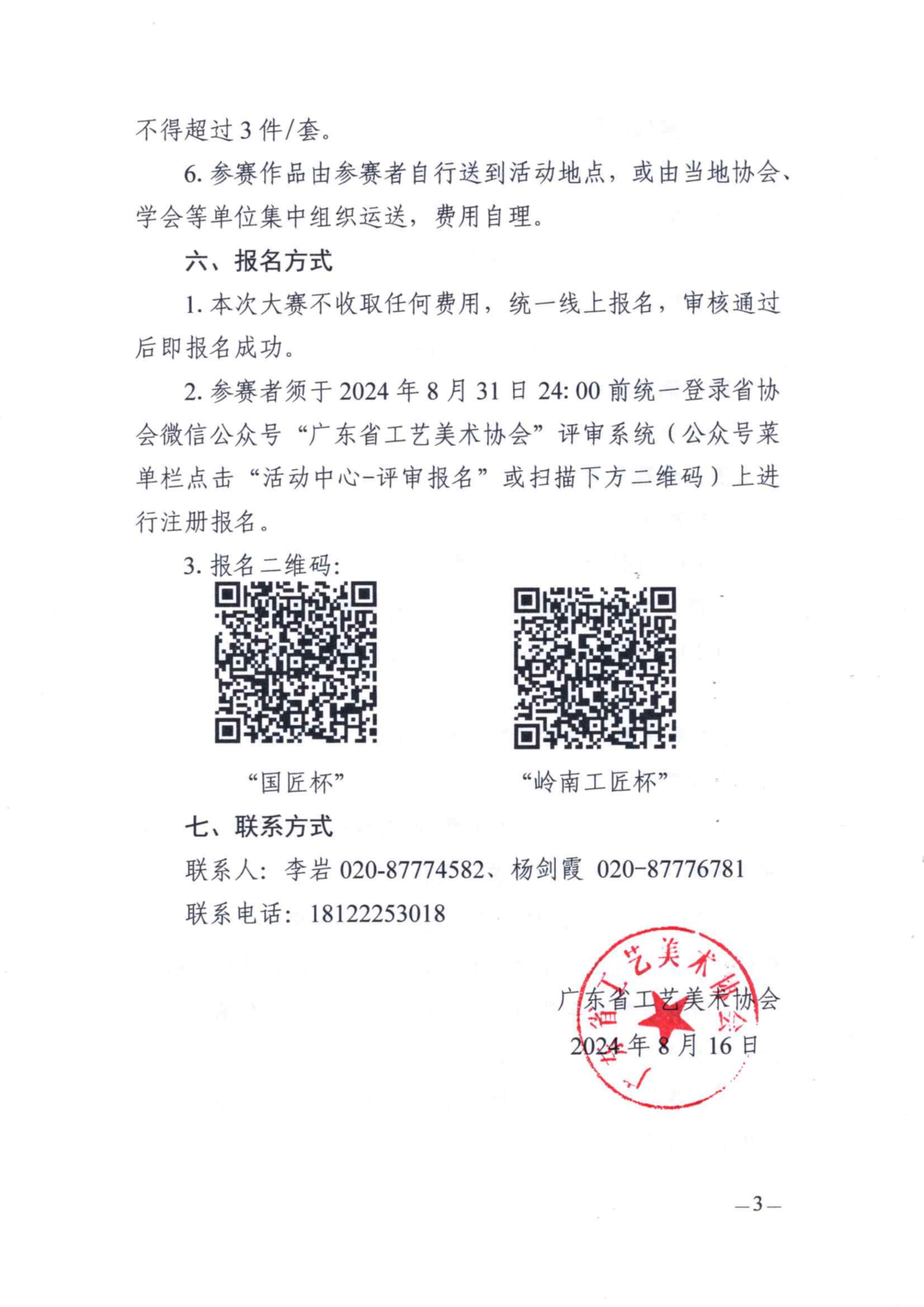 2024第七届粤港澳大湾区工艺美术“国匠杯”创作大赛及“岭南工匠杯”设计大赛艺赛中国8月25日 23:50发布1595 联系方式 ●广东省工艺美术协会 | 18122253018 👤李 岩 | 020-87774582 👤杨剑霞 | 020-87776781 联系我们 电话:020-87673625 邮箱:gdgyms@21cn.com 网址:http://www.gzartware.com/ © 版权声明文章版权归作者所有,未经允许请勿转载。THE END国内赛事# 大赛# 2024# 创作# 大湾区# 国匠杯 喜欢就支持一下吧