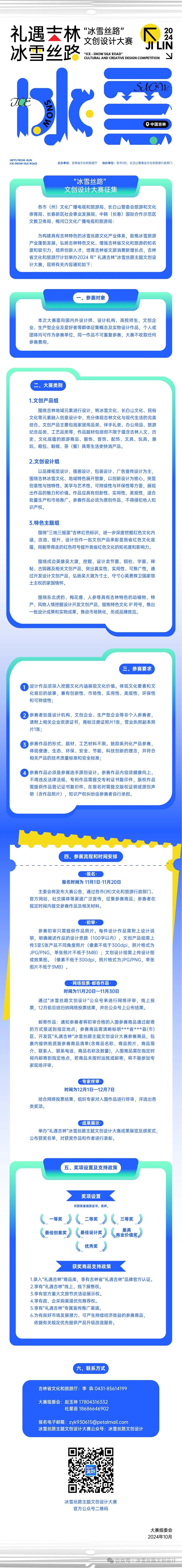 2024“礼遇吉林”冰雪丝路文创设计大赛艺赛中国10月29日 21:43发布1031 附件: 附件1:关于征集吉林省“礼遇吉林”冰雪丝路主题文创设计大赛报名表.docx 附件2:报名材料要求.docx 附件3:参赛承诺书.docx 附件4:大赛总体标准.docx © 版权声明文章版权归作者所有,未经允许请勿转载。THE END国内赛事# 大赛# 2024# 丝路# 冰雪# 吉林 喜欢就支持一下吧