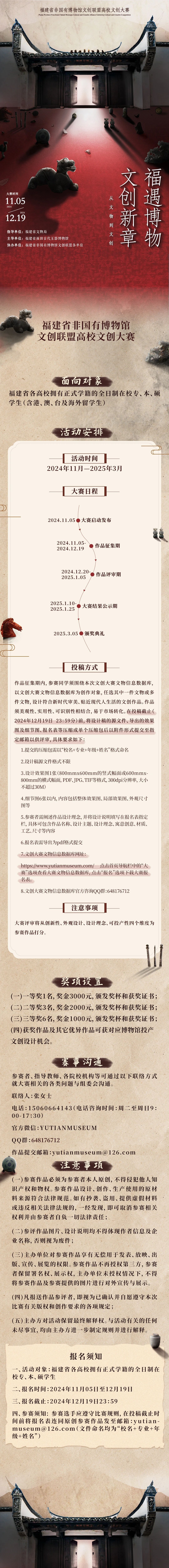 2024福建省非国有博物馆文创联盟高校文创大赛艺赛中国11月22日 21:43发布971 有参赛意愿的同学或对比赛有任何疑问者,请添加qq群:648176712。 点击下载:福建省非国有博物馆联盟高校文创大赛方案 点击下载:文创大赛报名表 © 版权声明文章版权归作者所有,未经允许请勿转载。THE END国内赛事# 大赛# 2024# 文创# 博物馆# 福建省 喜欢就支持一下吧