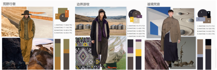 城野牧歌是一次自然与人类工业文明平衡下的乐章,主题色彩整体倾向以中明度与中纯度为主,整体色彩调性更为浓郁、厚重,以浓郁的自然色系为基调;搭配方式由近似色、邻近色组成,通过穿插较高彩度的浅黄色、金属色、波斯红作点缀。打造出原生自然感与现代工业的碰撞的、充满浓厚的自然人文氛围。