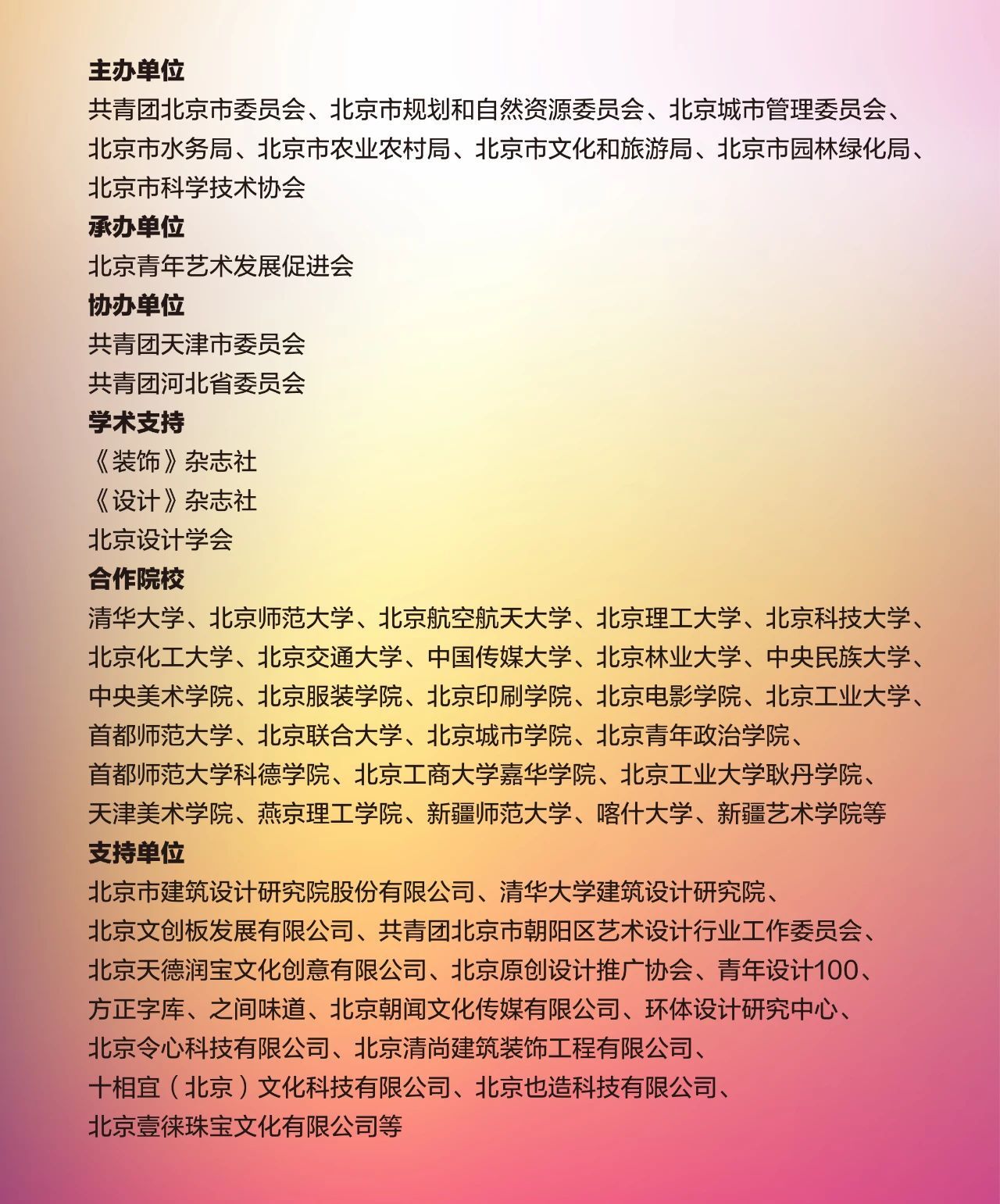 北京青年设计榜系列活动由共青团北京市委员会发起,北京市规划和自然资源委员会、北京市城市管理委员会、北京市水务局、北京市农业农村局、北京市文化和旅游局、北京市园林绿化局、北京市科学技术协会联合主办,北京青年艺术发展促进会承办,北京青年设计汇为执行平台。活动聚焦首都“四个中心”建设、京津冀协同发展等国家战略方针,是首都共青团实施“筑梦计划”、服务“两企三新”青年的重要举措之一。