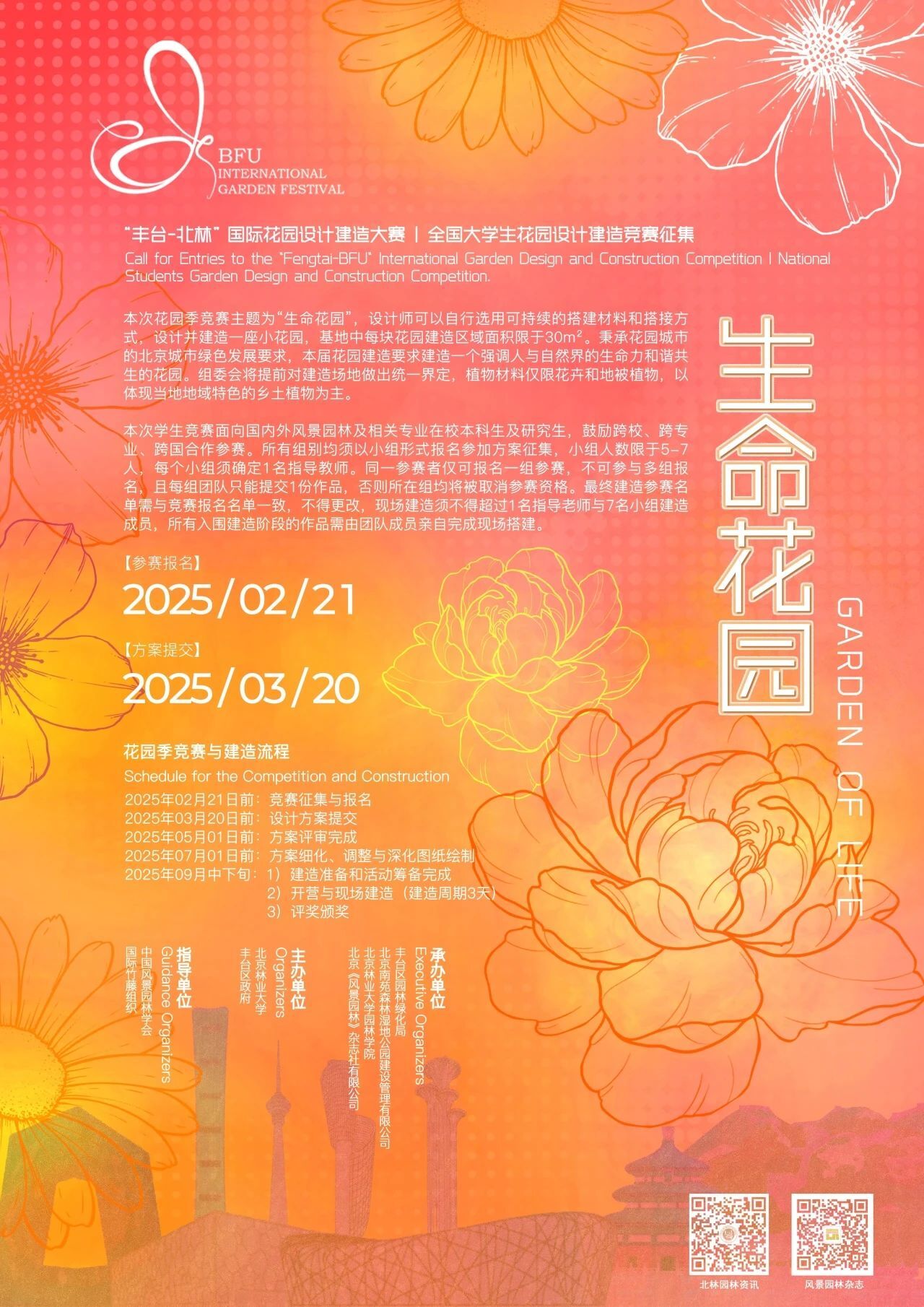 2025年2月21日前: 竞赛征集与报名 Before February 21, 2025: Registration 1)由学生自由组队报名; 2)关注“北林园林资讯”(ID:beilinyuanlinzixun)、“风景园林杂志”(ID:LAmagazine)微信公众号或《风景园林》杂志官网(www.lalavision.com),点击竞赛通知页面“阅读原文”或扫描下方二维码报名; 1) Students can form teams freely to register. 2) Follow the WeChat official accounts “北林园林资讯” (ID: beilinyuanlinzixun) and “风景园林杂志” (ID: LAmagazine), or visit the official website of the magazine (www.lalavision.com), click on the “阅读原文” button on the competition page or scan the QR code below to register. 3)报名截止时间:2025年2月21日23:59(北京时间),须确定指导教师及团队成员名单。报名后将得到一个注册号,由组委会通过电子邮件告知参赛者。 3) The registration deadline is 23:59 (Beijing time) on February 21, 2025. The list of the advisor and team members must be confirmed by then. After registration, a registration number will be provided and informed to the participants via email by the organizing committee. 2025年3月20日前: 设计方案提交 Before March 20, 2025: Submission of design proposals 1)方案格式要求 设计方案排布于一张横向A0图版上(高841mm,宽1189mm),JPG格式,分辨率300dpi,文件大小不超过30M。图版中应包含设计图及设计说明,文字须为中英双语(或英语)。图版中不得出现任何透露作者、指导教师及所属学校与单位的内容。文件命名方式为“注册号.jpg”,如:S045.jpg。 2)方案提交截止时间:2025年3月20日23:59(北京时间)。 3)方案提交邮箱:contest@lalavision.com。 1) Submission requirements: The design project should be presented on an A0 printed panel (841 mm high, 1189 mm wide) in landscape format, saved as JPG with a 300-dpi resolution, the file size should not exceed 30M. The panel should include the presentation of the scheme, the related images and descriptions. Use both English and Chinese (or only English). No author, advisor and institution information should be mentioned on the panel. The panel must be saved as a JPG and named as ‘registration number.jpg’, such as ‘045.jpg’. 2) Deadline: March 20, 2025, 23:59 (Beijing Time) 3) Please email the submission to: contest@lalavision.com 2025年5月1日前: 方案评选 Before May 1, 2025: Entry review 竞赛组委会组织专家评审团对参赛方案的设计创意及建造可行性进行评审,遴选出入围作品,并通过终审答辩确定入选花园建造阶段的实施作品。 本次竞赛将共有25个组进入终审答辩环节,遴选出10个优胜方案将进入最终建造阶段,根据建造成果现场评审确定最终获得一等奖、二等奖、三等奖的作品。 The competition organizing committee will organize an expert review panel to evaluate the design creativity and construction feasibility of the submitted proposals, select the shortlisted works, and the works for the construction stage will be determined through the final defense. A total of 25 groups will enter the final defense stage. Ultimately, 10 winning proposals will be selected to enter the final construction stage. The first, second, and third prize-winning works will be determined based on the on-site review of the construction results. 2025年7月1日前: 方案细化、调整与深化图纸绘制 Before July 1, 2025: Detailed Design, Adjustment and Deepened Drawing 在开始深化设计前,组委会将根据评委和合作单位的意见,要求入选团队进行基于实际建造可行性的方案深化调整。由合作单位向入选团队提供技术指导,直至完成深化图纸绘制。 入选建造阶段的竞赛类作品均须绘制深化图纸,以PDF格式提交组委会。深化图纸文件为A3文本,包含平立剖深化图,设计及建造说明、设计尺寸、材料做法、节点构造、细部大样、预制构件、施工进度等。 Before commencing the detailed design, the organizing committee will, based on the opinions of the judges and the cooperating organizations, require the selected teams to make adjustments to their proposals in light of the feasibility of actual construction. The cooperating organizations will provide technical guidance to the teams until the detailed drawings are completed. All competition entries selected for the construction phase must submit detailed drawings in PDF format to the organizing committee. The drawing files should be in A3 format and include detailed plans, elevations and sections, design and construction descriptions, design dimensions, material specifications, construction details, detailed samples, prefabricated components, and construction schedules. 2025年9月中下旬: 现场建造、评奖、颁奖仪式及展览 Mid-to-late September, 2025: Completion of on-site construction, awarding ceremony and exhibition 1)入选建造团队于2025年9月中下旬参加在北京举办的“丰台-北林”国际花园设计建造大赛开营仪式,并开始花园建造工作。建造周期为3天。 2)参与现场建造的团队需同时携带1:10花园模型到场。 3)花园季组委会于现场建造结束后组织国内外知名专家进行评奖。颁奖仪式上将由特邀嘉宾为获奖团队颁发证书。 1) The selected construction teams will participate in the opening ceremony of the “Fengtai—BFU” International Garden Design and Construction Competition held in Beijing in mid-to-late September 2025 and start the garden construction work. The construction period is 3 days. 2) The teams participating in the on-site construction need to bring a 1:10 garden model to the site at the same time. 3) After the on-site construction is completed, the organizing committee will organize well-known experts at home and abroad to conduct the review. At the awarding ceremony, the invited guests will present certificates to the