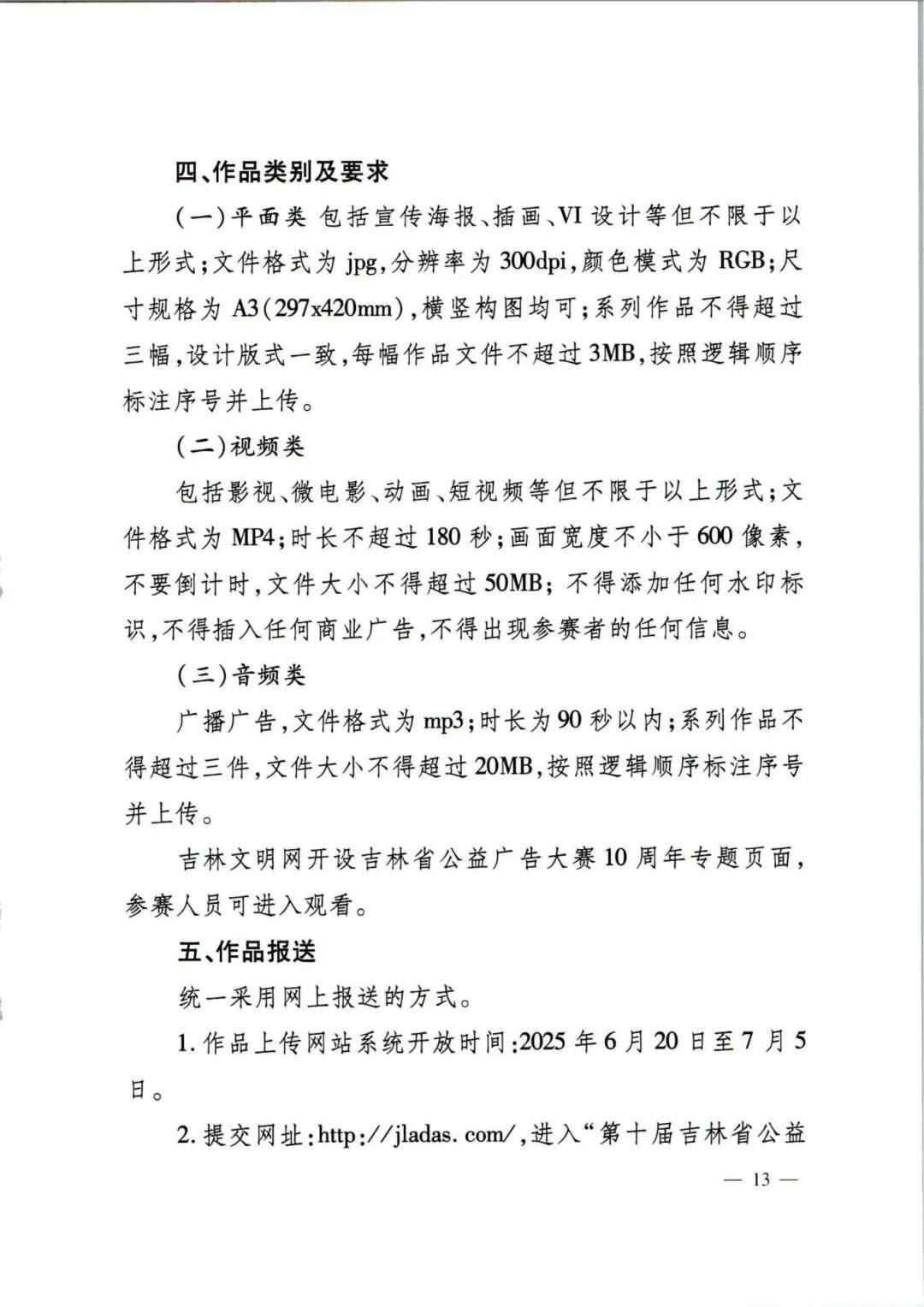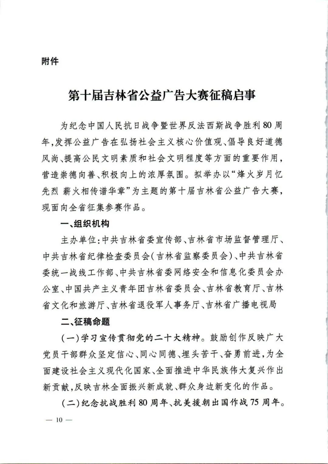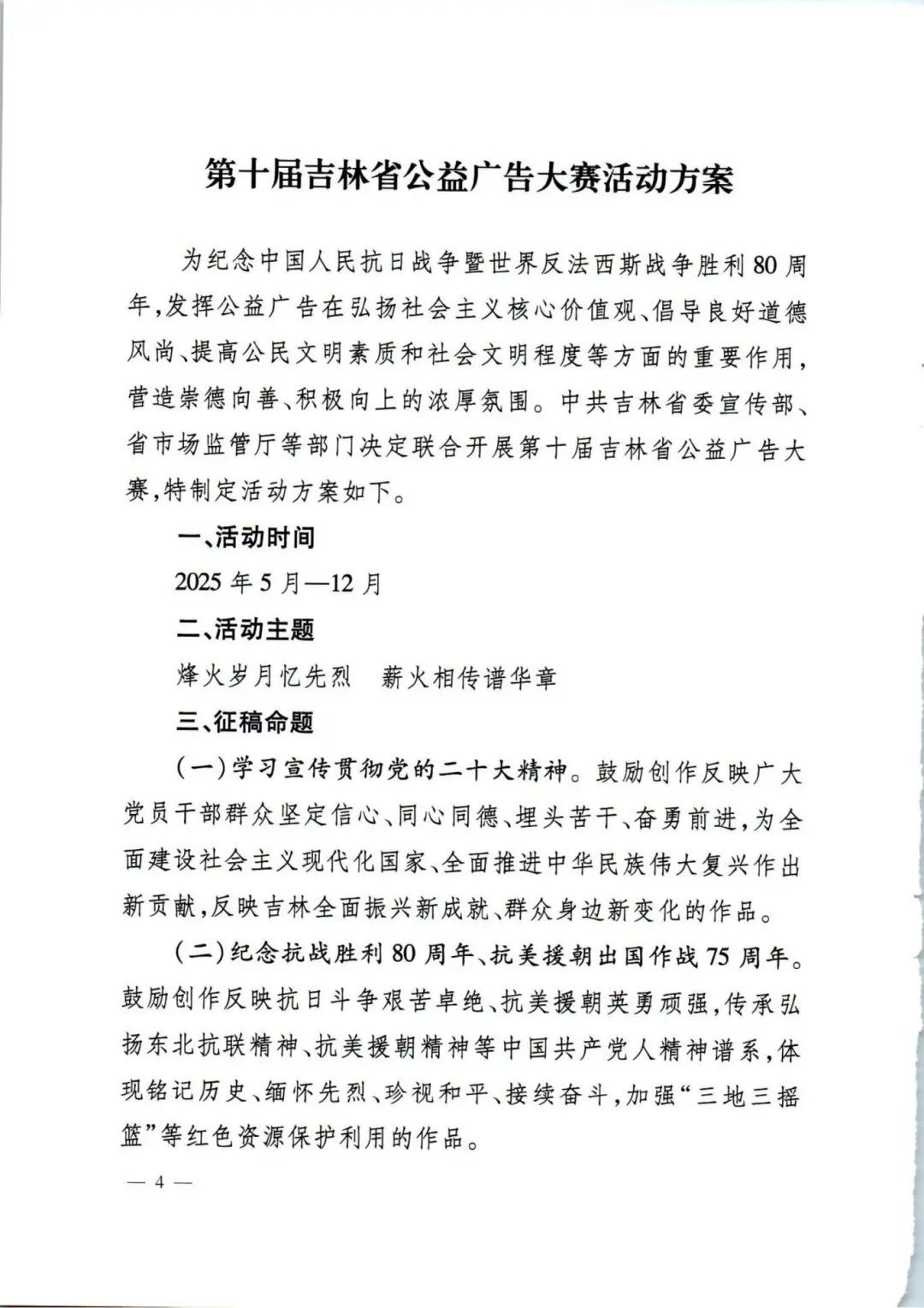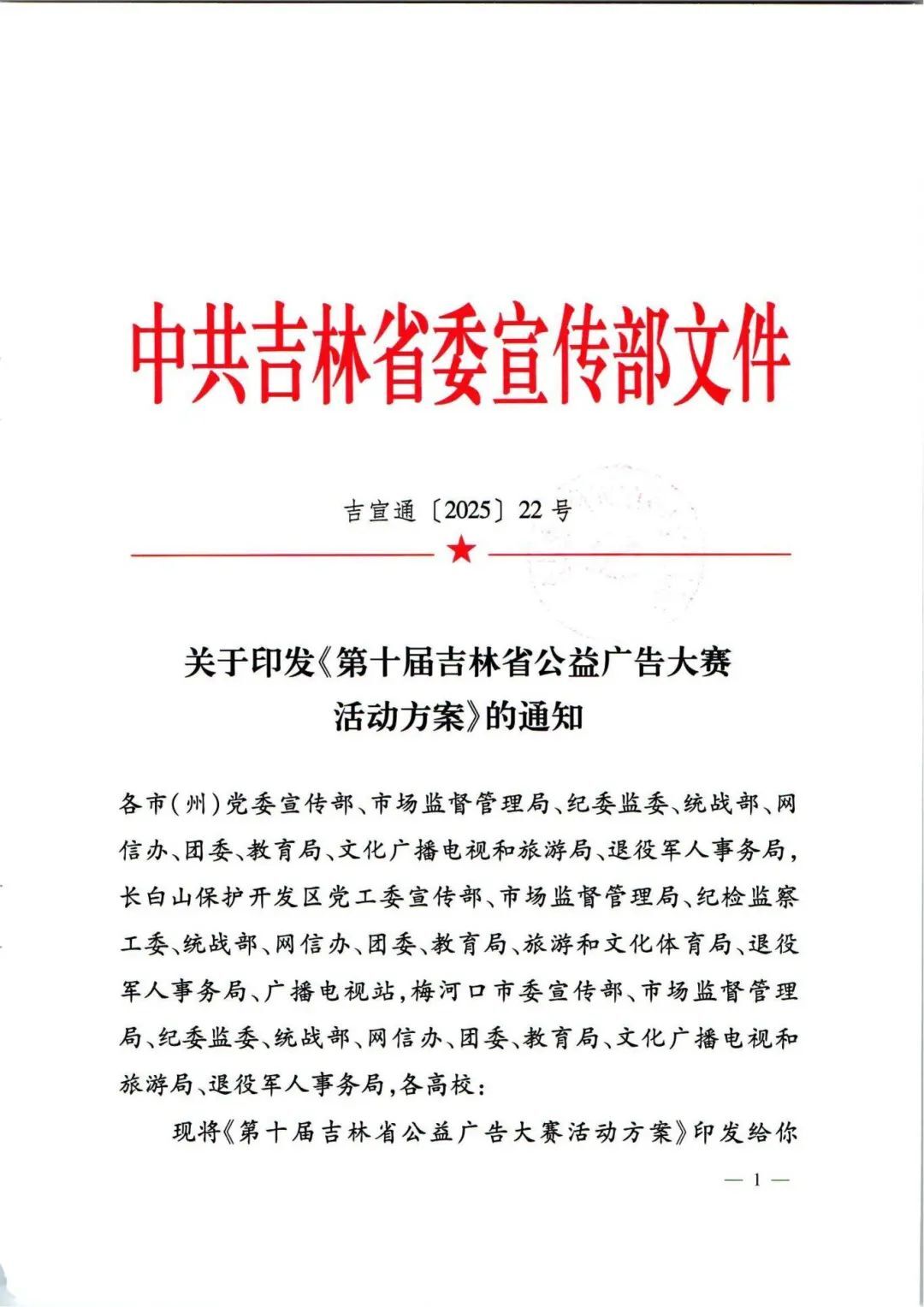 2025第十届吉林省公益广告大赛艺赛中国5月24日 21:43发布1745 点击下载:关于印发《第十届吉林省公益广告大赛活动方案》的通知 © 版权声明文章版权归作者所有,未经允许请勿转载。THE END国内赛事# 大赛# 2025# 公益# 广告# 吉林省 喜欢就支持一下吧