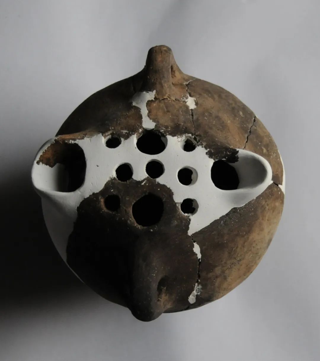 顶端有大小不一的九个圆孔,双流及耳两两对称,斜弧肩,微鼓腹,平底。高15.6厘米、底径8.1厘米。有专家认为,这件九孔双流壶是原始社会祭祀用的器皿。
