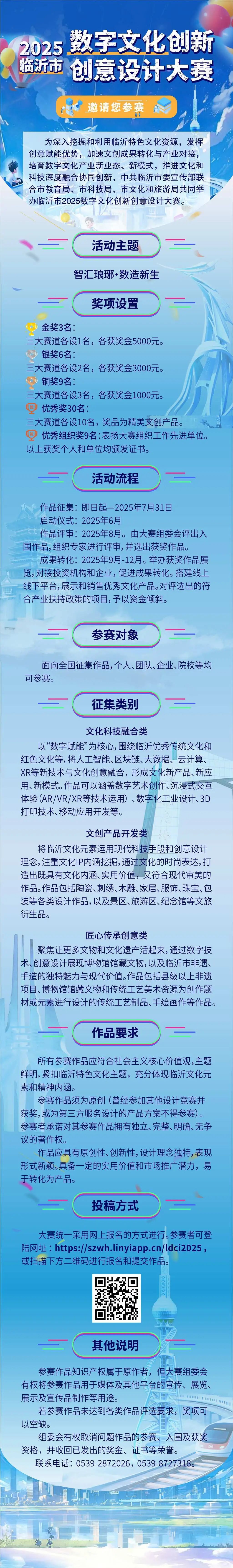 为深入挖掘和利用临沂特色文化资源,发挥创意赋能优势,加速文创成果转化与产业对接,培育数字文化产业新业态、新模式,推进文化和科技深度融合协同创新,中共临沂市委宣传部联合市教育局、市科技局、市文化和旅游局共同举办临沂市2025数字文化创新创意设计大赛。