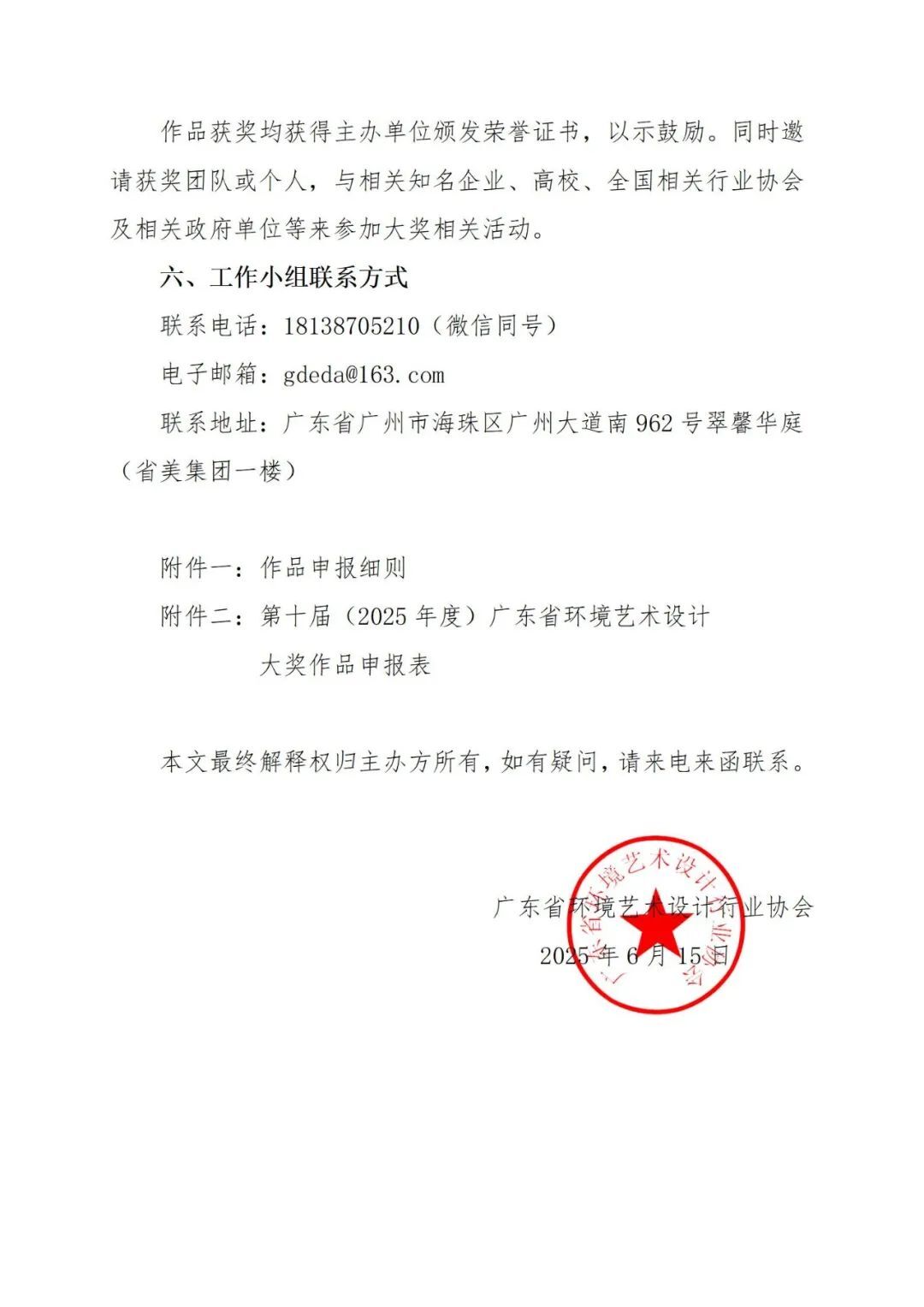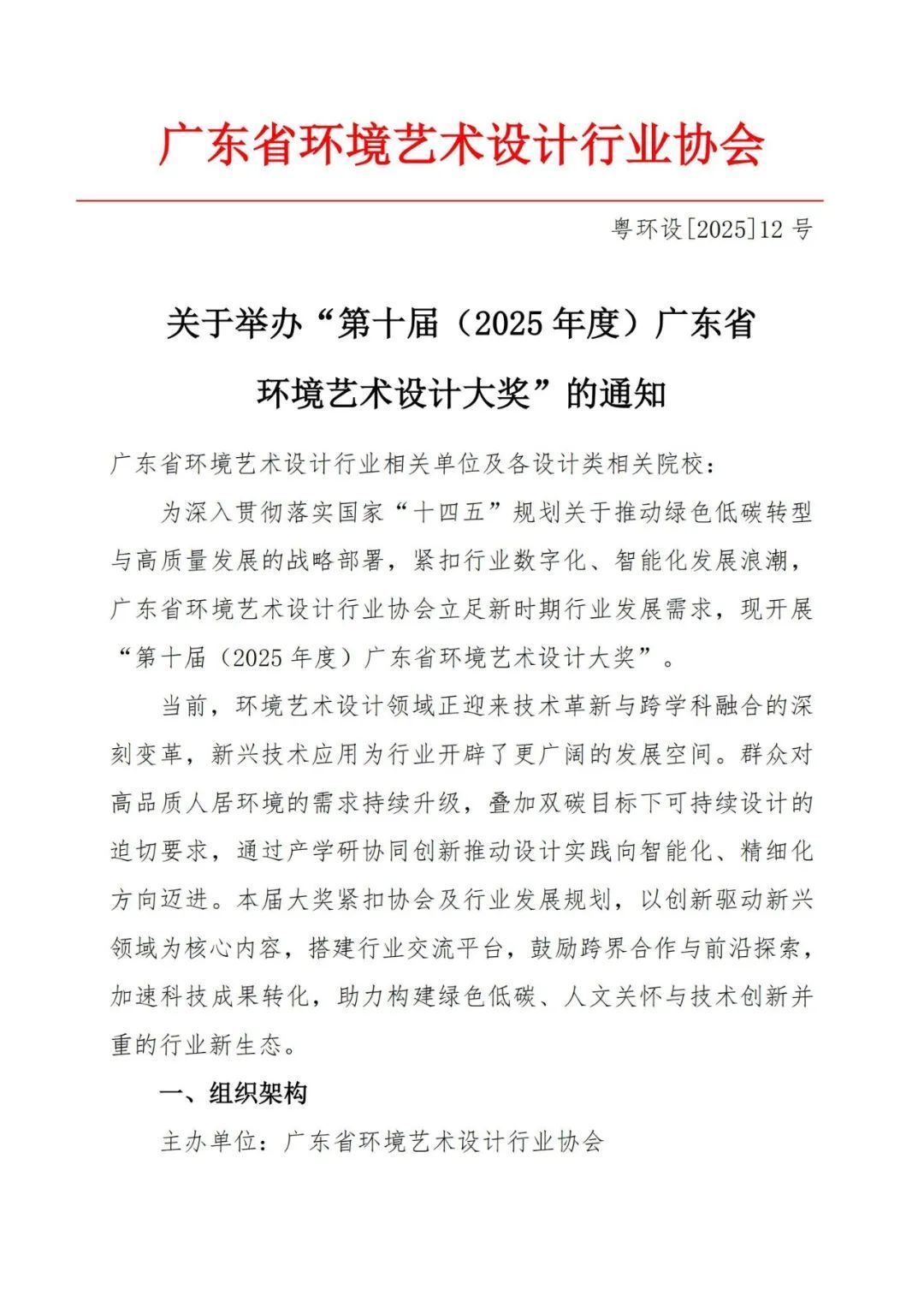 为深入贯彻落实国家“十四五”规划关于推动绿色低碳转型与高质量发展的战略部署,紧扣行业数字化、智能化发展浪潮,广东省环境艺术设计行业协会立足新时期行业发展需求,现开展“第十届(2025年度)广东省环境艺术设计大奖”。