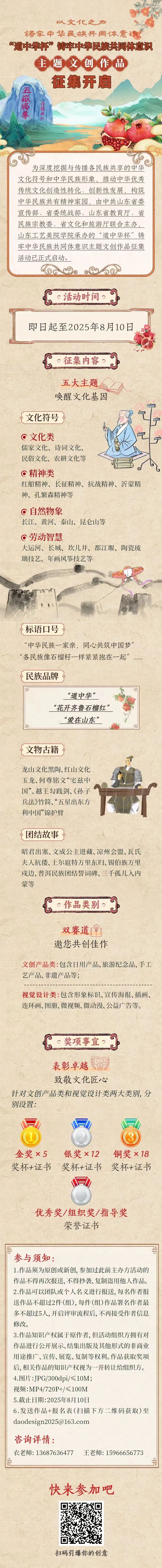 2025“道中华杯”铸牢中华民族共同体意识文创作品征集艺赛中国7月30日 08:25发布797 © 版权声明文章版权归作者所有,未经允许请勿转载。THE END国内赛事# 2025# 征集# 作品# 中华# 共同体 喜欢就支持一下吧