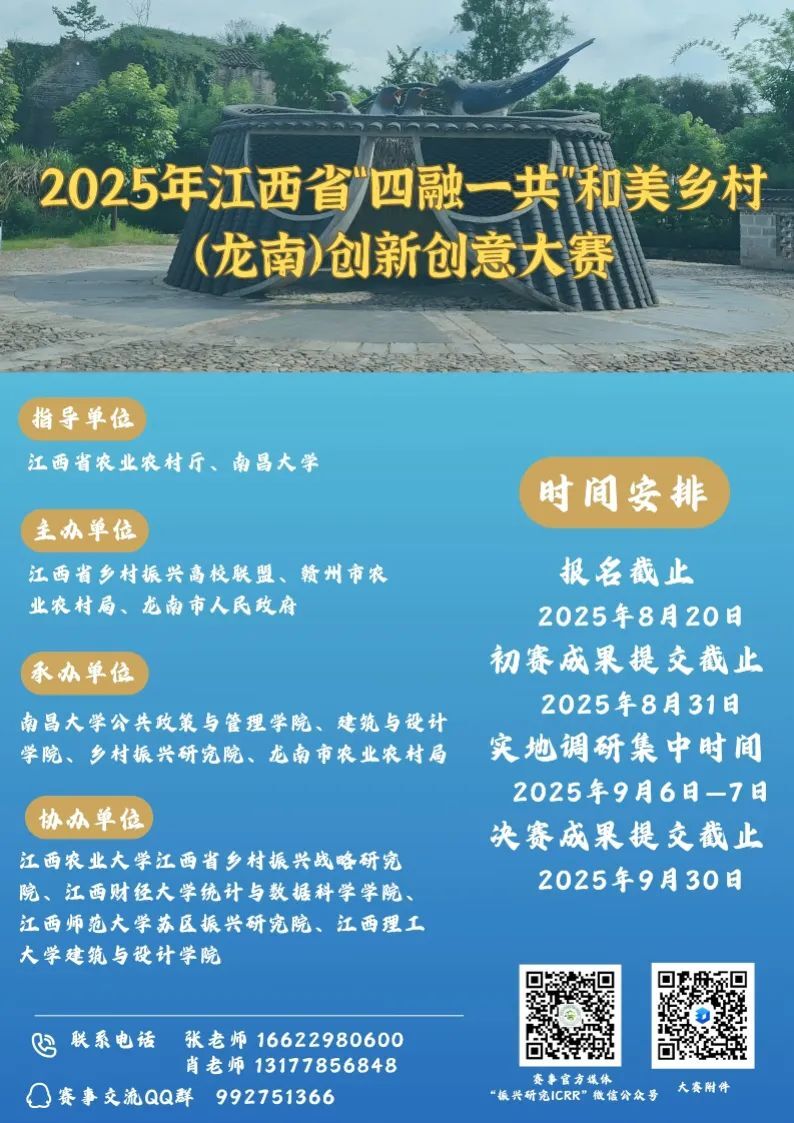 为深入贯彻落实习近平总书记对“千万工程”经验的重要指示和考察江西重要讲话精神,扎实推进“百校联百县兴千村”行动,积极助力“四融一共”和美乡村建设,江西省乡村振兴高校联盟在江西省农业农村厅、南昌大学指导下,联合赣州市农业农村局、龙南市人民政府,举办2025年江西省“四融一共”和美乡村(龙南)创新创意大赛。现将有关事宜通知如下: