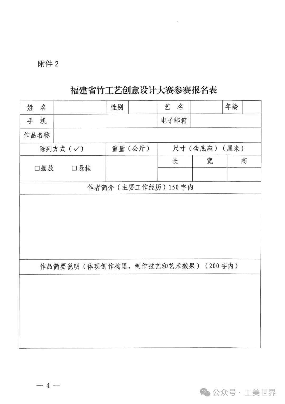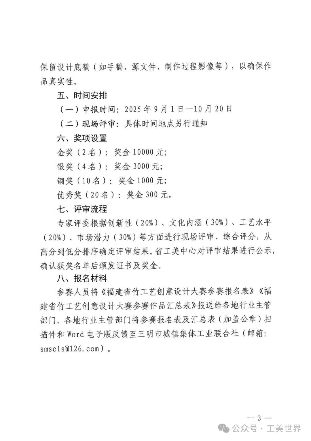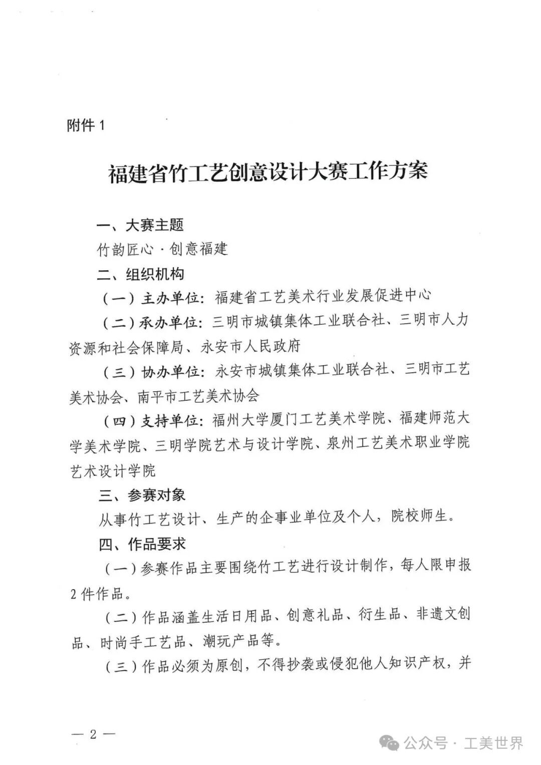 2025福建省竹工艺创意设计大赛艺赛中国9月12日 21:43发布833 © 版权声明文章版权归作者所有,未经允许请勿转载。THE END国内赛事# 大赛# 2025# 创意# 福建省# 工艺 喜欢就支持一下吧