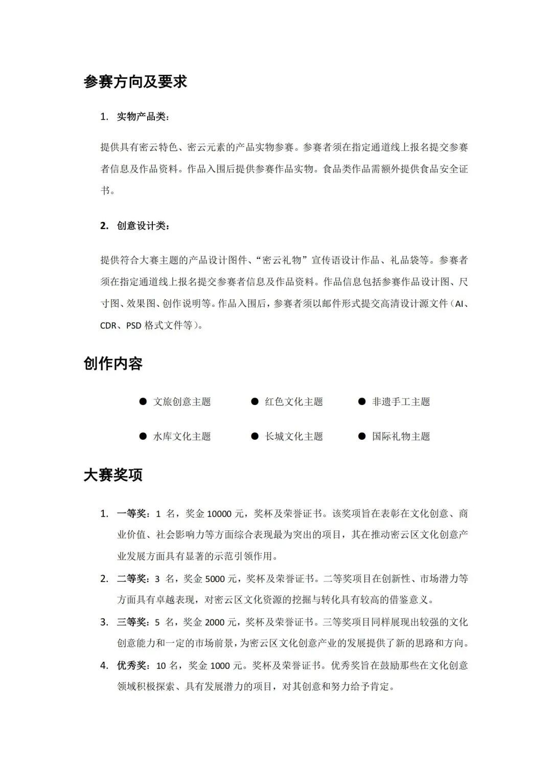 丰厚奖励加持,提供多元发展机会。赛事设置丰厚奖项与多元权益,实物产品类和创意设计类分别设有一等奖1名(奖金10000元+荣誉证书+奖杯)、二等奖3名(各5000元+荣誉证书)、三等奖5名(各2000元+荣誉证书)、优秀奖10名(各1000元+荣誉证书)。获奖作品不仅能获得奖金与荣誉,还可获“密云礼物”商标授权,入驻线下旗舰店及线上平台,获政府官方媒介宣推,更有机会被推荐至“北京礼物”“外事礼物”等更高平台。