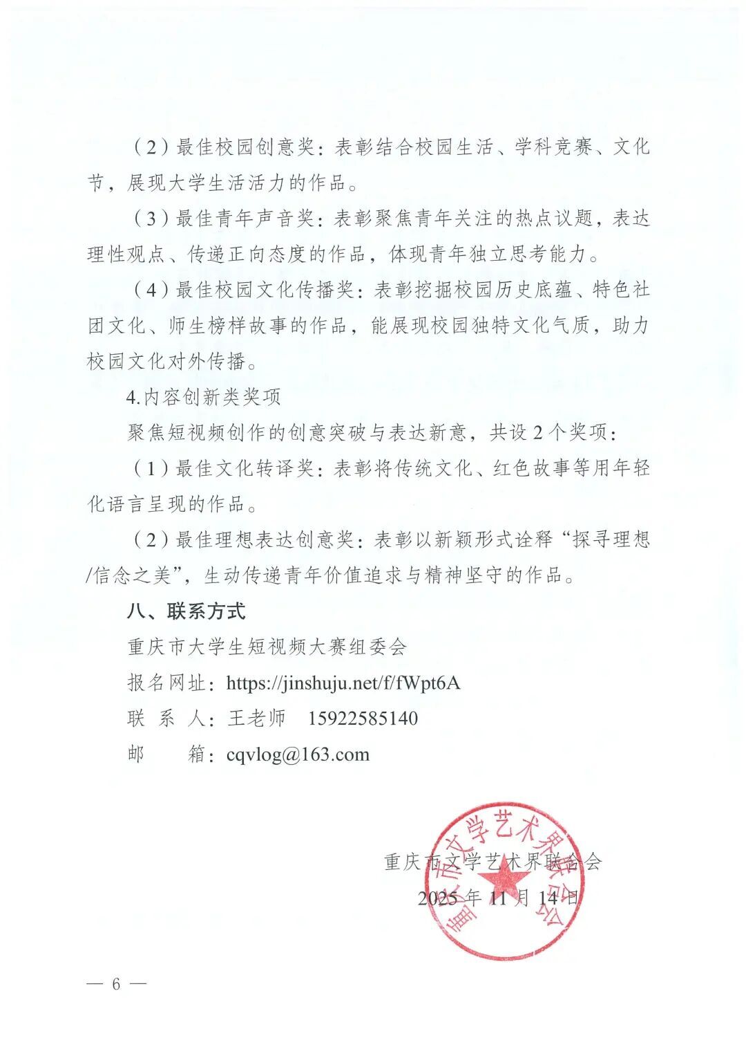 “渝艺新视界·青春筑未来”2025第五届重庆市大学生短视频大赛艺赛中国12月14日 21:43发布417 点击链接报名:https://jsj.top/f/fWpt6A © 版权声明文章版权归作者所有,未经允许请勿转载。THE END国内赛事# 大赛# 2025# 大学生# 短视频# 渝艺新视界 喜欢就支持一下吧