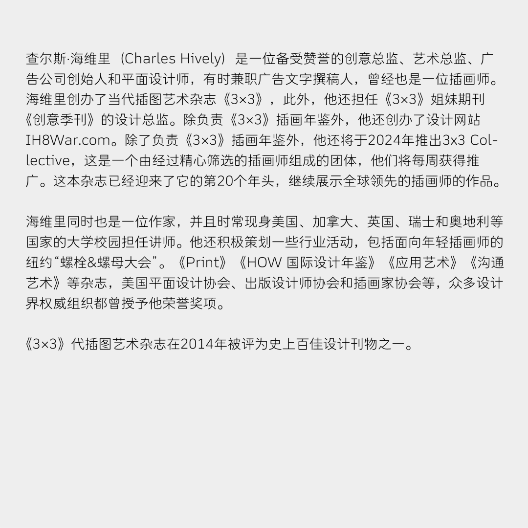 自2012年创立以来,Hiii Illustration国际插画奖已成功举办十二届,累计邀请过来自全球五大洲的60余位国际知名插画师、学者担任评委,并收到了来自100多个国家或地区的超过40,000件参评作品。经过十余年的积淀,该奖项在规模、质量及行业影响力方面均不断提升,已成为亚太地区乃至全球插画领域内一项极具权威性与公信力的重要奖项。