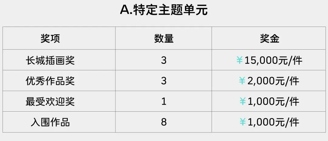 01. 特定主题单元内的长城插画奖、优秀作品奖、最受欢迎奖将获得相应奖金。