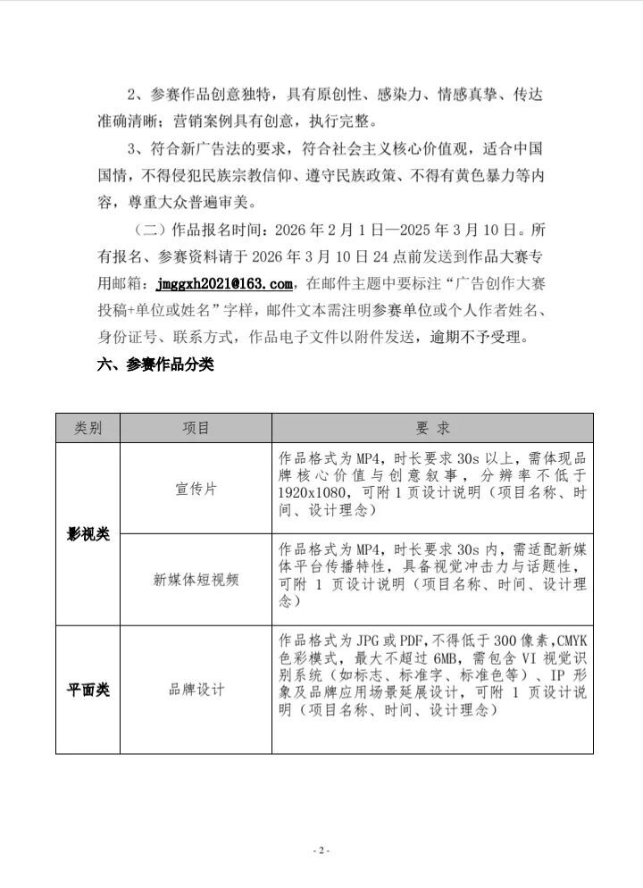 (二)作品报名时间:2026 年 2月 1 日—2026 年 3 月10 日 。所有报名、参赛资料请于2026 年3 月 10 日24点前发送到 作品 大赛专用邮箱: jmggxh2021@163.com,在邮件主题中要标注“广告创作大赛投稿+单位或姓名”字样,邮件文本需注明参赛单位或个人作者姓名、身份证号、联系方式,作品电子文件以附件发送,逾期不予受理。