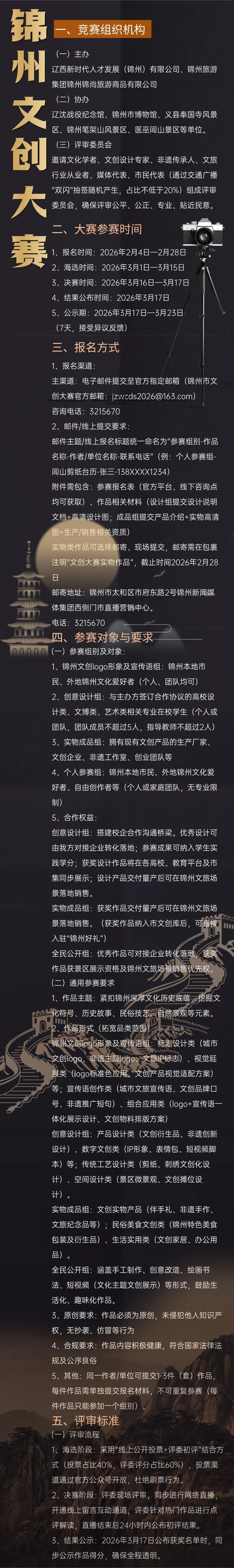 2026(首届)锦州文创大赛艺赛中国2月28日 19:30发布763 © 版权声明文章版权归作者所有,未经允许请勿转载。THE END国内赛事# 大赛# 文创# 2026# 首届# 锦州 喜欢就支持一下吧