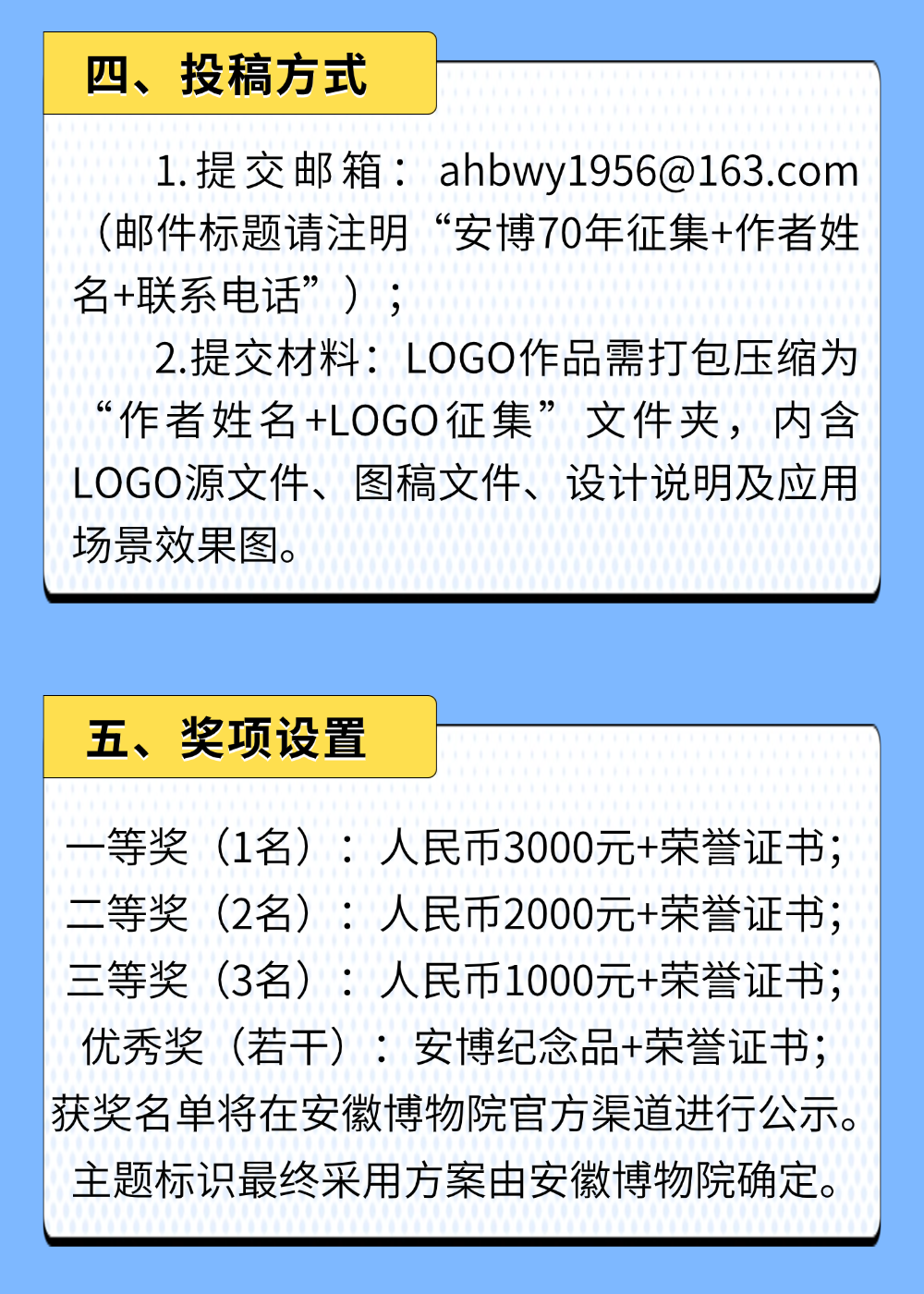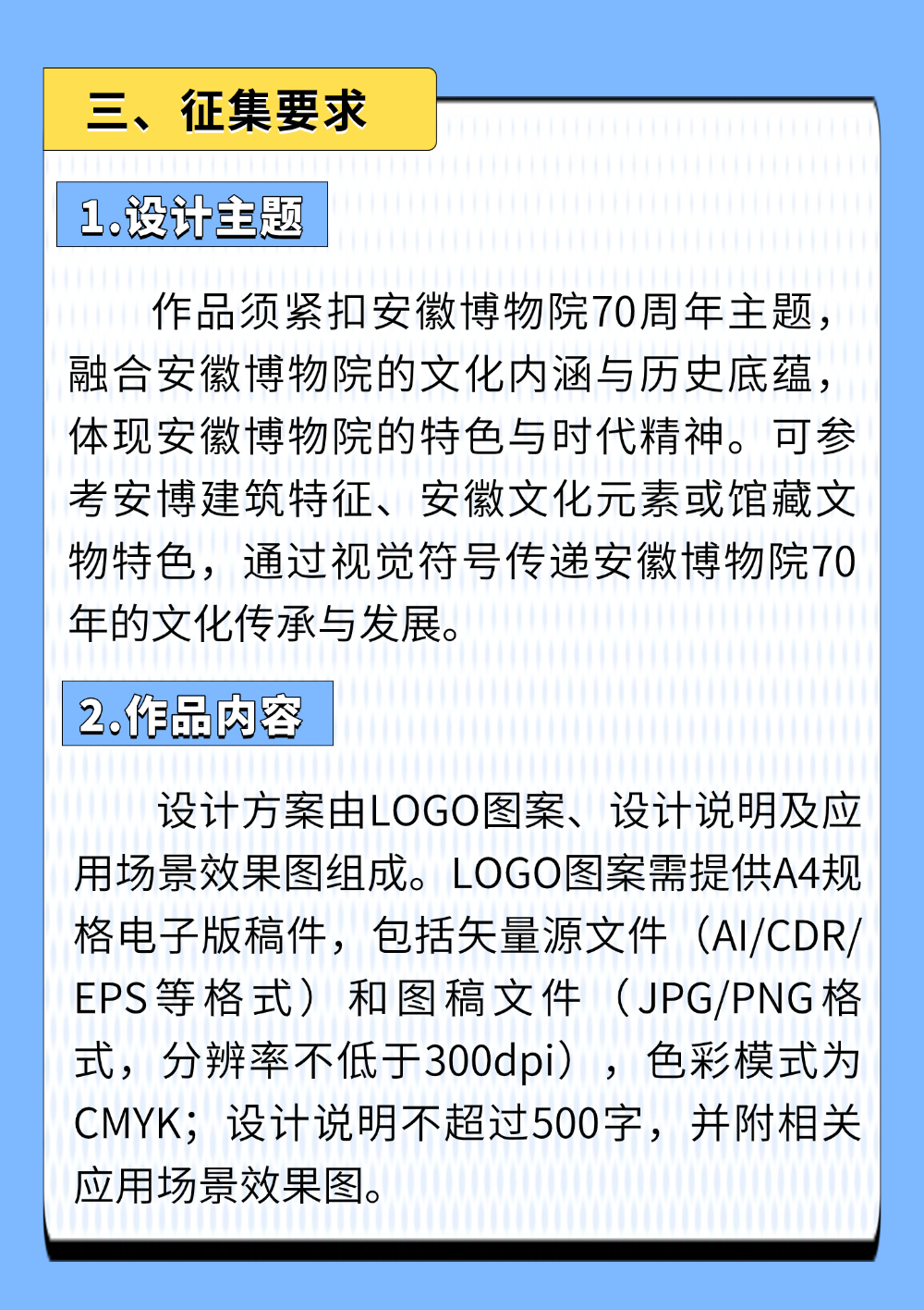 安徽博物院70周年主题标识(LOGO)设计方案征集公告艺赛中国3月23日 21:43发布915 © 版权声明文章版权归作者所有,未经允许请勿转载。THE END国内赛事# 公告# logo# 主题# 周年# 70 喜欢就支持一下吧