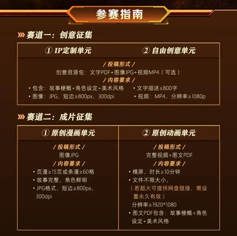 本次大赛以“链接创意沃土,孵化产业未来”为核心,搭建创意征集与成片征集双赛道体系。创意征集板块涵盖IP定制单元与自由创意单元,专注扶持早期原创创意:创作者仅需提交故事梗概、角色设定及美术风格方案即可参与投稿,以低门槛参与模式,为优质创意提供充足的生长空间;成片征集板块则包含原创漫画单元与原创动画单元,鼓励创作者提交成熟作品。两大赛道同步开放,覆盖创意全生命周期,助力优质内容从灵感走向现实。
