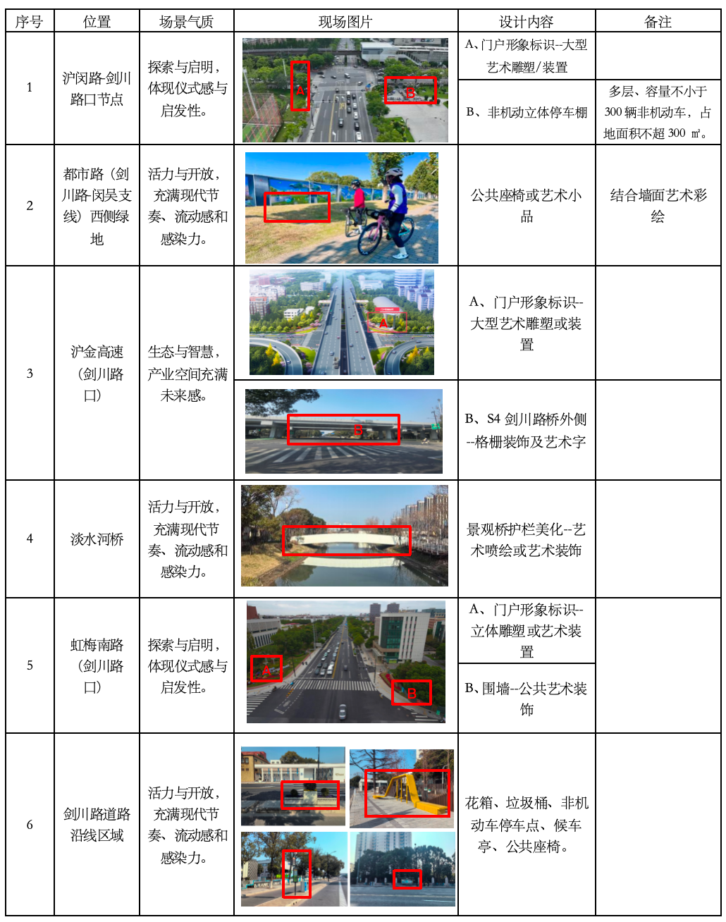 1.3 具体设计场景、内容和现场场景VR:沪闵路—剑川路节点、沪金高速—剑川路节点、莲花南路—剑川路节点等6大点位,需设计艺术装置、公共座椅、公共设施等内容(详情见文末 附件一)。