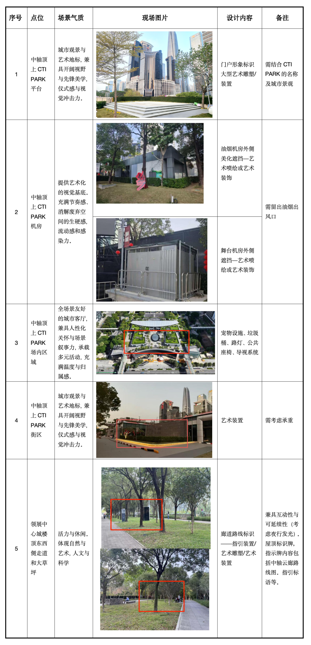 2.3 具体设计场景、内容和现场场景VR :中轴云廊顶上空间CTI PARK平台、中轴云廊顶上空间CTI PARK机房、领展中心城段东侧通道等5大点位,需设计艺术装置、公共座椅、公共设施等内容(详情见 文末附件二)。