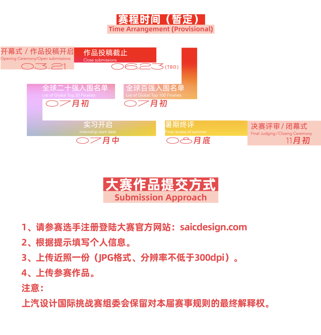 在各学校战队中我们将与校方指导老师共同评选出最佳作品入选上汽设计国际挑战赛闭幕式及颁奖典礼,入选团队需提供: