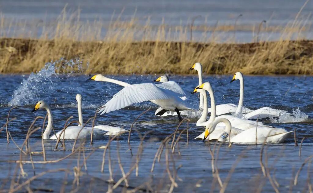 天鹅在鄂尔多斯市达拉特旗境内的黄河湿地飞翔。王正 摄(人民图片网)